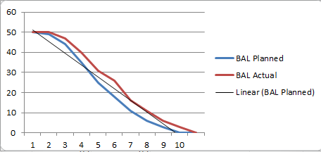 For the sake of this discussion we will use the same data. Here we see story points on the left vertical axis and time on the horizontal axis.