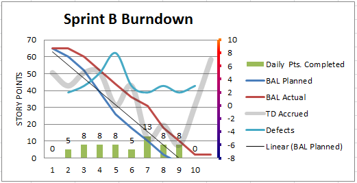 Technical debt is the gray line that undulates throughout the project. It aligns with the right vertical axis. The ups and downs are a drag anchor on your productivity potential. The blue line is the defect count and also aligns with the right axis. The green bars along the bottom are the daily points completed. We can now see more clearly how technical debt and defects can tamp down productivity in terms of daily points completed. In essence, the team has ‘plateaued’. Every day the team spends churning on technical debt and defect management is another day of lost potential. The lesson is that you might hit the velocity you planned but is there a stretch goal you just can’t quite hit? Perhaps, it’s time to dig deeper.
